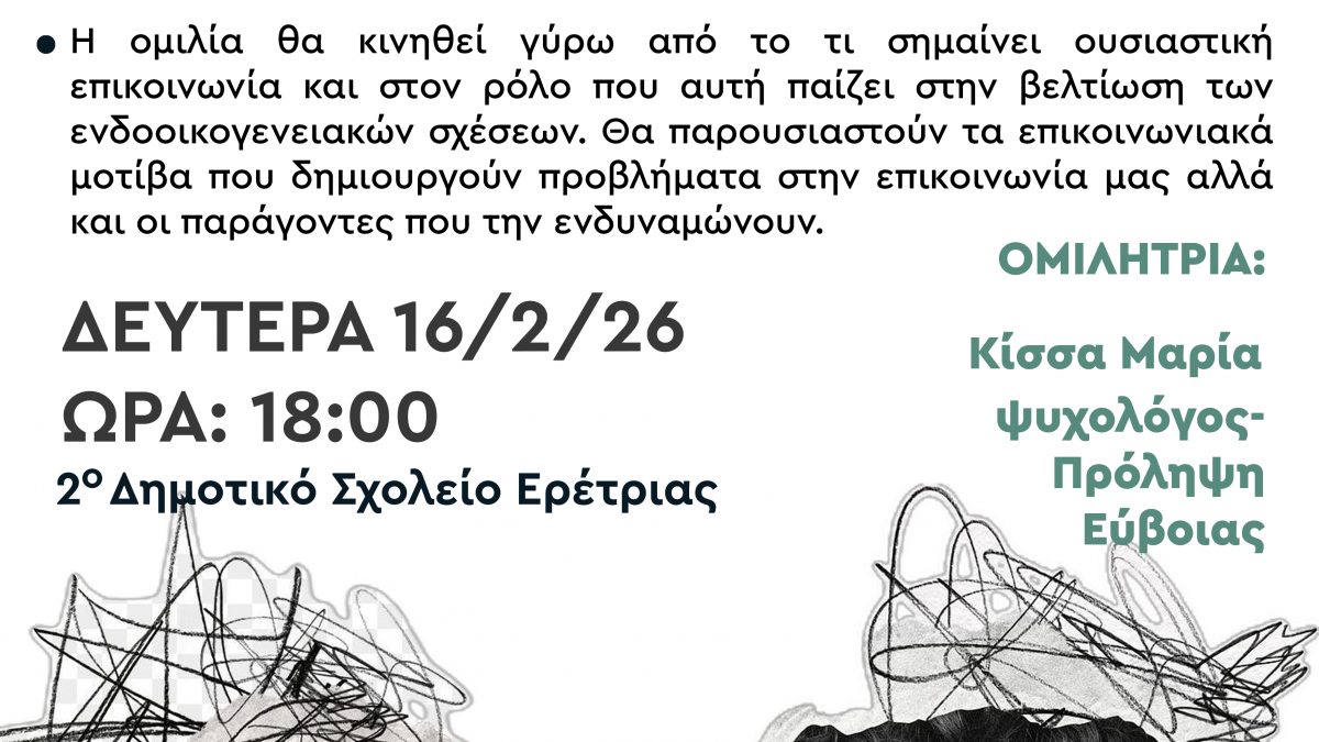 Το Κέντρο Πρόληψης των Εξαρτήσεων και Προαγωγής της Ψυχοκοινωνικής Υγείας Π.Ε. Ευβοίας, με πρωτοβουλία της Διευθύντριας, κ. Ελένης Μιτζιφίρη, υλοποίησε ενημερωτική ομιλία σε γονείς, στις 16 Φεβρουαρίου 2026, στο 2ο δημοτικό σχολείο Ερέτριας.